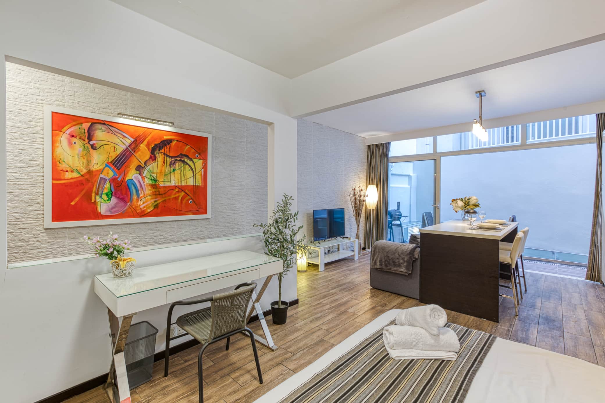 Bright open-plan studio with fully equipped kitchenette and dining space